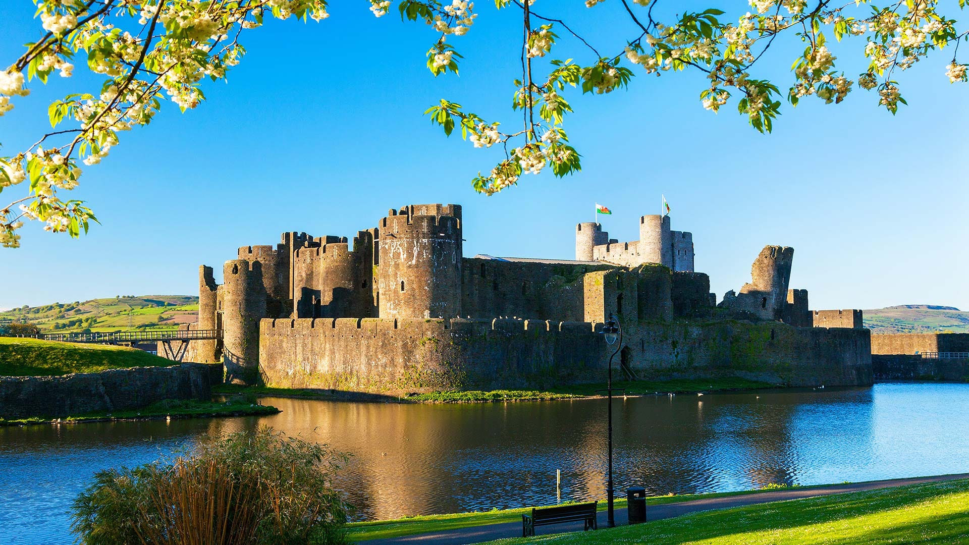Caerphilly castle in South Wales. They also have a working trebuchet or did once!